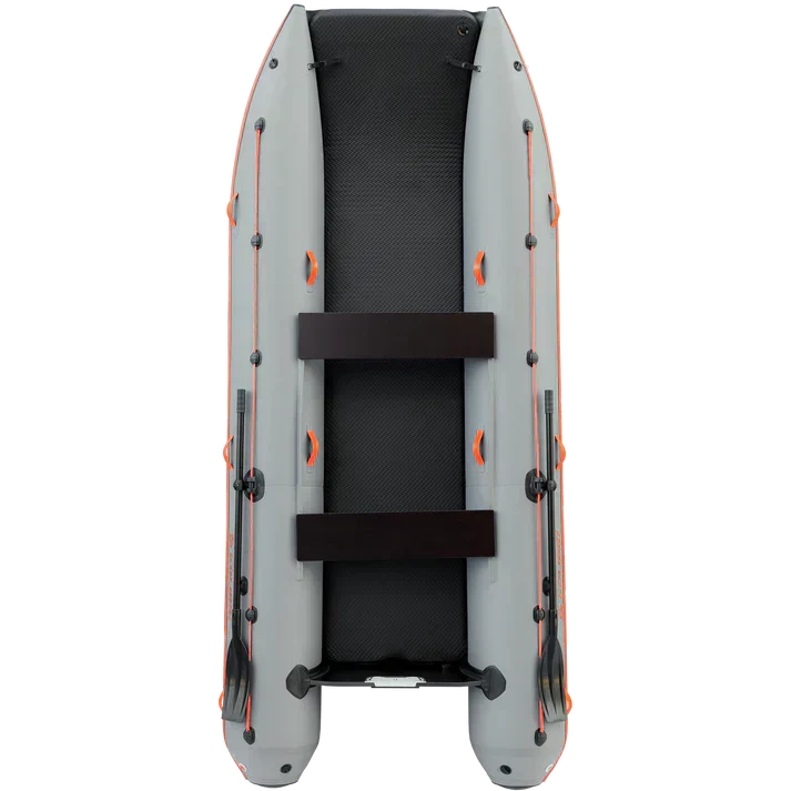 The high-pressure inflatable floor is made from heavy-duty PVC which makes the boat light and easy to assemble.